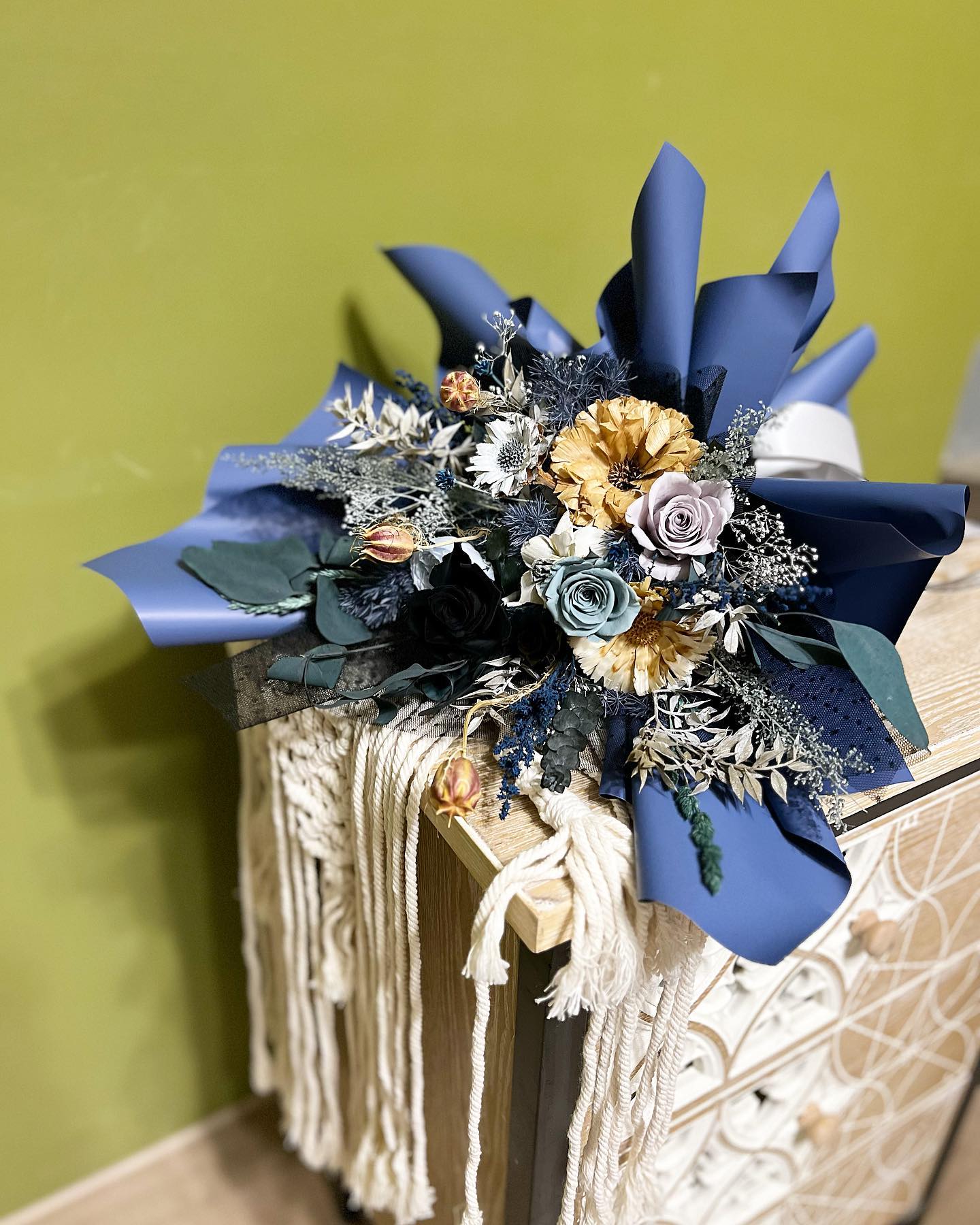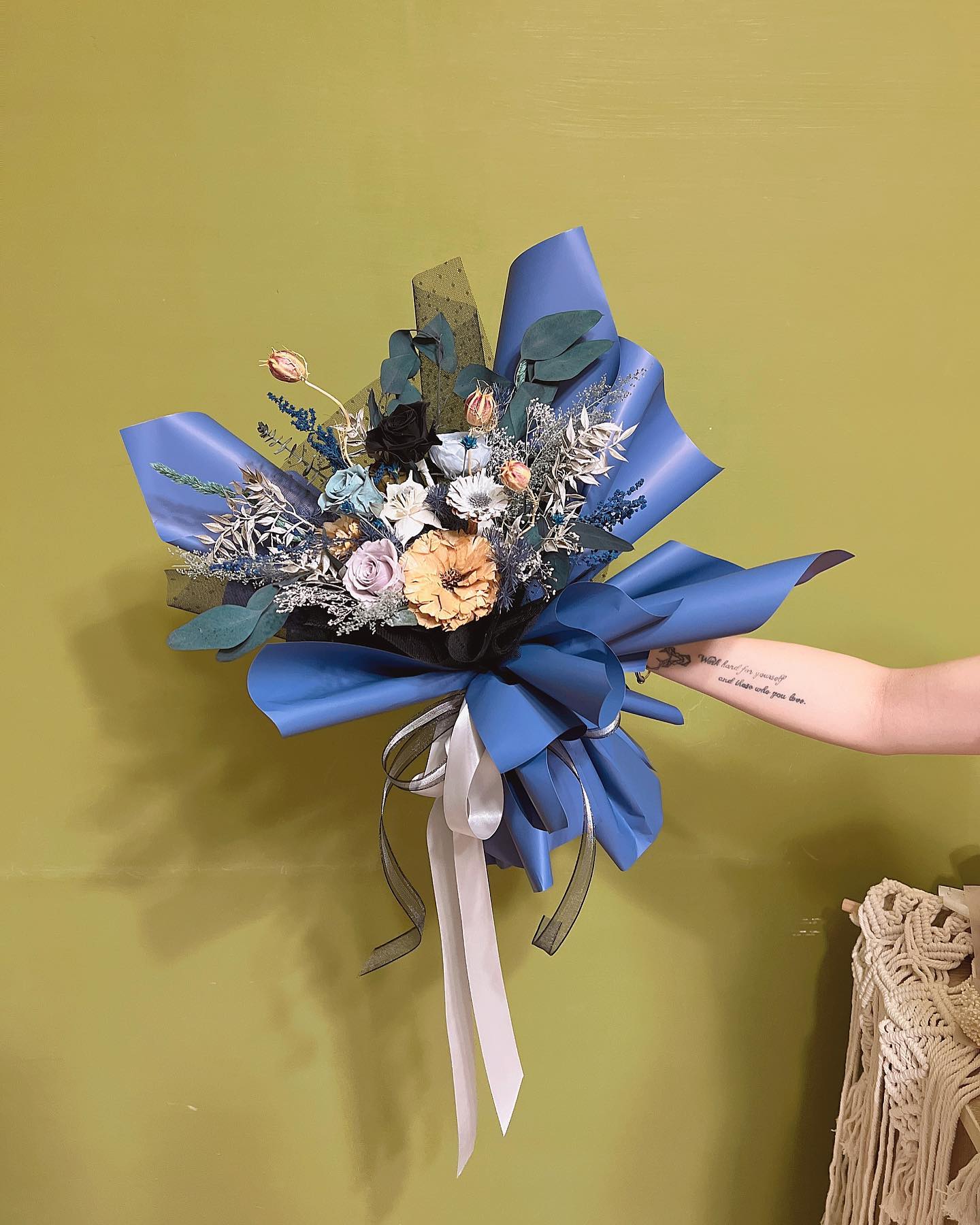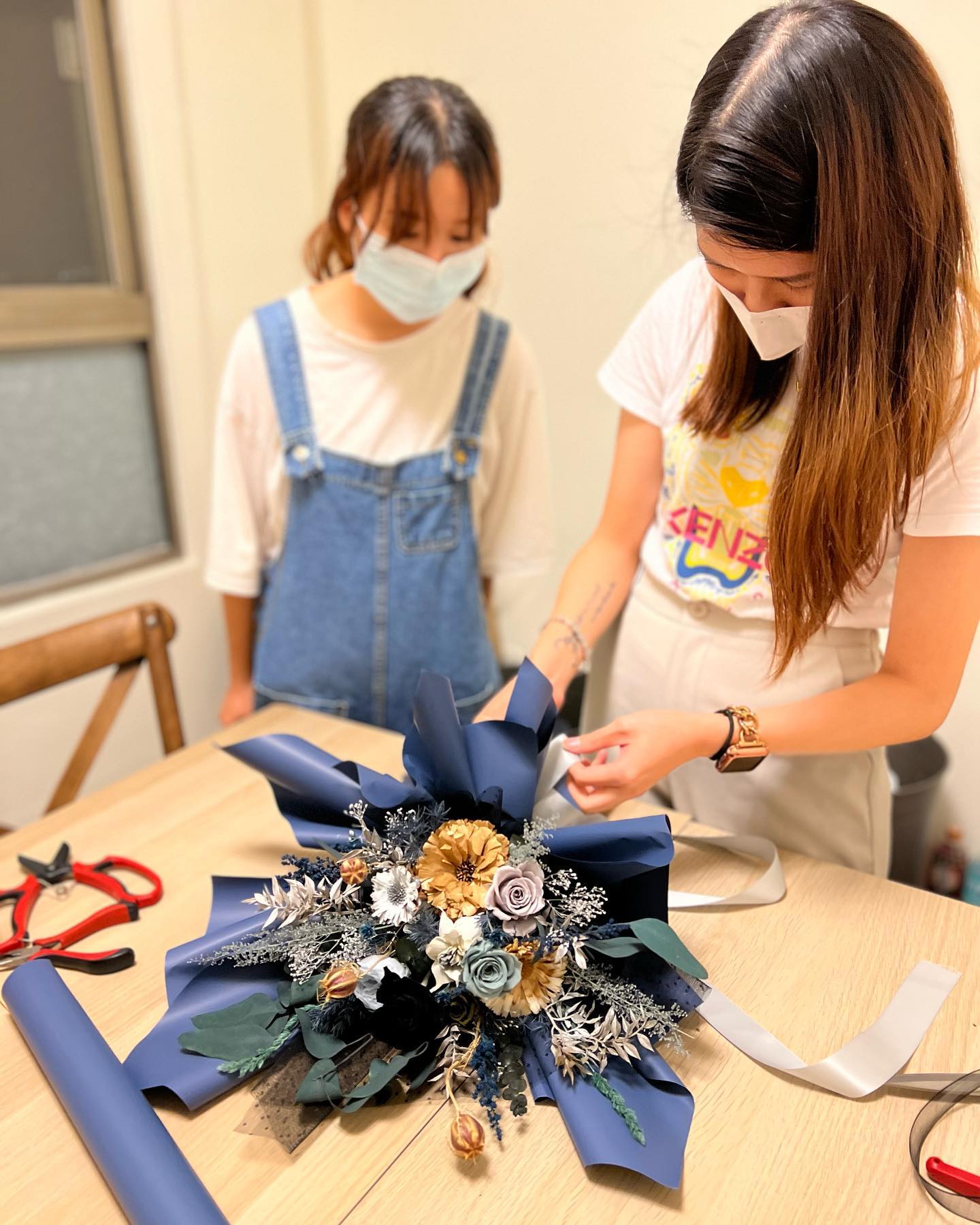 每個學生個性和喜好不同 通常上完第一堂後 我會根據學生給我的感覺 配置第二堂不凋花的花材及配色 每個人都是獨一無二的 當然完成的花束也是專屬於妳